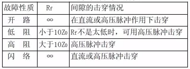 以上分類的目的也是為了選擇測試方法的方便,根據目前流行的故障測距技術,開路與低阻故障可用低壓脈沖反射法,高阻故障要用沖擊閃絡法測試,而閃絡性故障可用直流閃絡法測試。現場人員有把Rf<100KΩ的故障稱為低阻故障的習慣,主要是因為傳統的